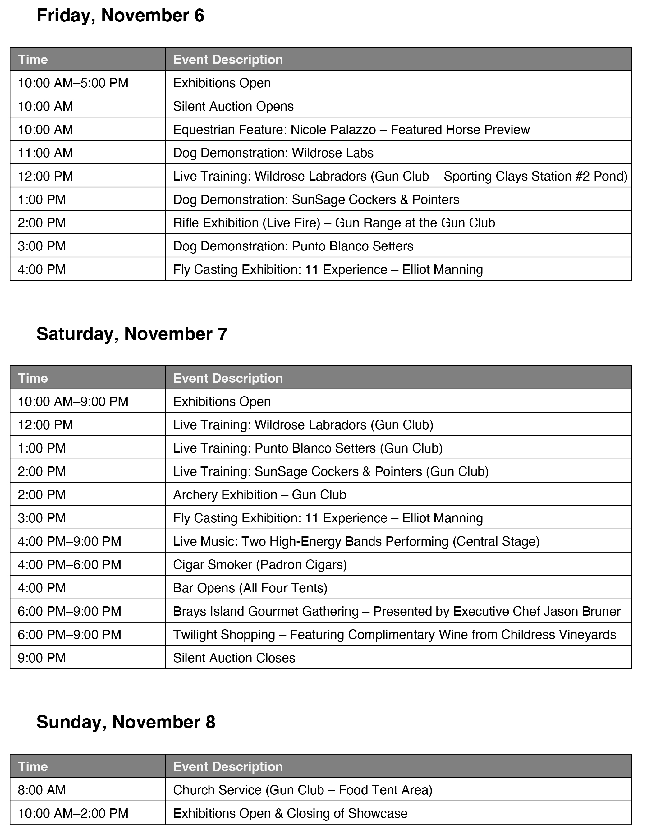 Beyond shopping, the Showcase offers a vibrant atmosphere with live music on a central stage surrounded by gathering tables, beautifully lit for evening enjoyment. Guests will experience Twilight Shopping on Saturday night — thanks to Richard and Judy Childress for sponsoring the event and providing wine for all from their Childress Vineyards, a cigar reception sponsored by Padron Cigars, and captivating live sporting dog demonstrations and training events on the Gun Club and Hunt Club properties.